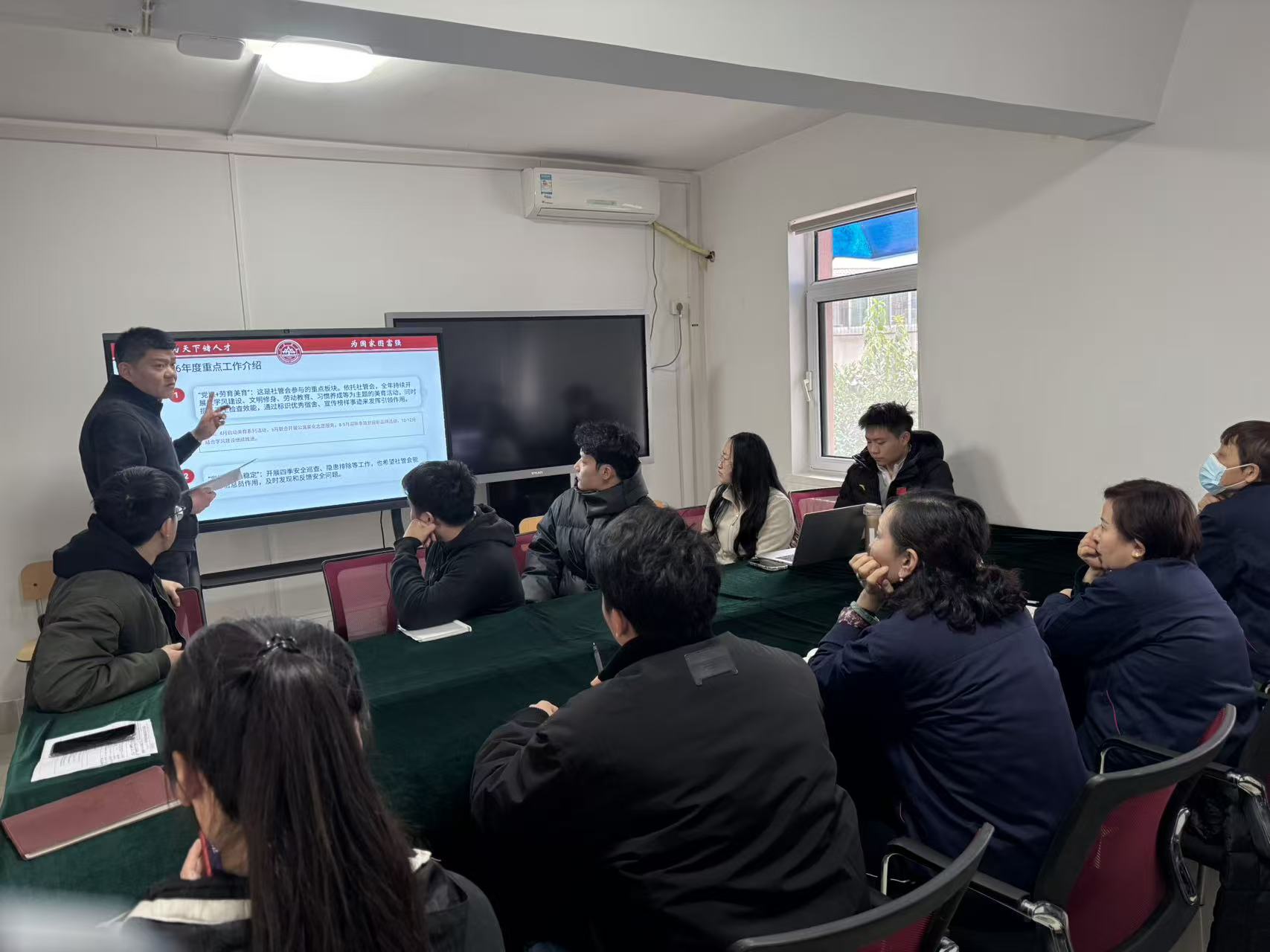 随后,李磊主任详细介绍了2026年与社管会关联度较高的重点工作:一是“党建+劳育美育”,依托社管会全年开展学风建设、文明修身、劳动教育等主题活动,提升卫生检查效能,发挥优秀宿舍榜样引领作用;二是“党建+安全稳定”,开展四季安全巡查,发挥社管会信息员作用;三是“党建+暖心服务”,包括毕业季护航、新生服务指南编制、迎新党员先锋岗等;四是“党建+结对帮扶”,协助发现和关怀困难学生;五是“党建+队伍建设”,鼓励社管会优秀骨干参与微党课暖心故事分享。