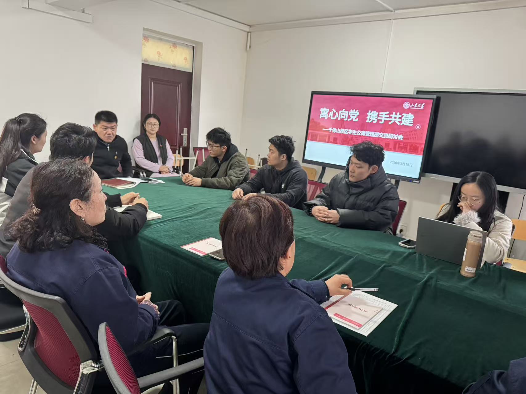 2026年3月18日,千佛山校区学生公寓管理部召开“寓心向党,携手同行”交流研讨会。公寓中心党支部成员、社管会全体学生干部以及服务保障队伍中的党员同志参加会议。会议旨在向社管会传达公寓中心党支部2026年“寓心向党”品牌建设及“党建+”七大行动工作要点,明确社管会在年度重点工作中的角色与任务,听取意见建议,凝聚共识,共促学生公寓管理与服务提质升级。